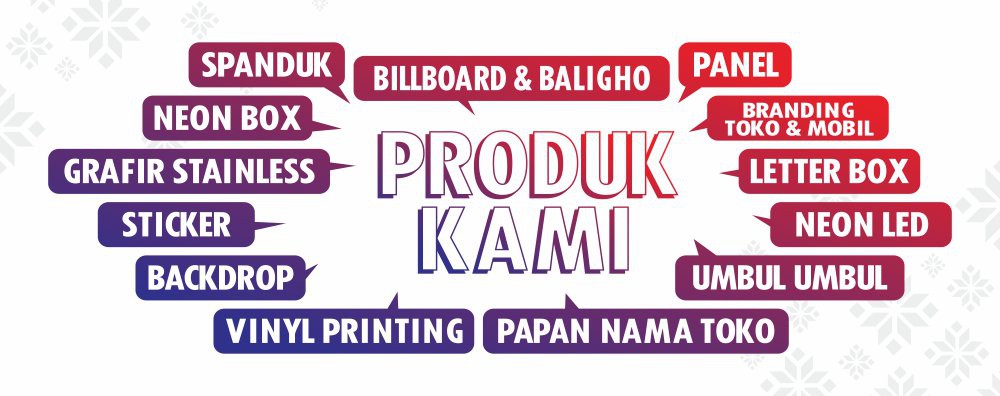 Perusahaan kami adalah perusahaan jasa yang berpengalaman dalam bidang promosi reklame dan design, yang meliputi; billboard, baligho, backdrop, neon box, neon sign, letter timbul, ACP, spanduk, umbul-umbul, digital printing, serta jasa promosi lainnya.